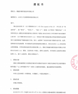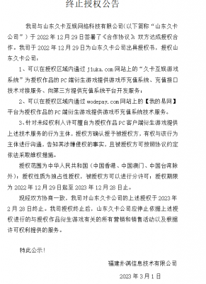 202308-10终止授权公告 我司与山东久卡互娱网络科技有限公司(以下简称“山东久卡公司”)于2022年12月29日签署了《合作协议》,双方达成授权合作。...