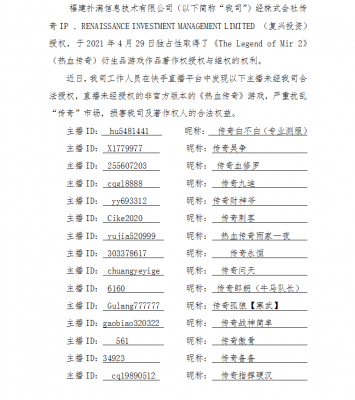 202109-15株式会社传奇IP(“传奇IP”)作为《Legendof MIR2》(中文版名称为《传奇》或《热血传奇》)的著作权共有人,针对贪玩游戏聘请知名影星谢霆锋代言推出的...