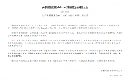 202110-13关于搜服搜服(sfsf.com)违法行为的打击公告 在线购买世界杯信息技术有限公司(以下简称“我司”)经株式会社传奇IP 、RENAISSANCE...